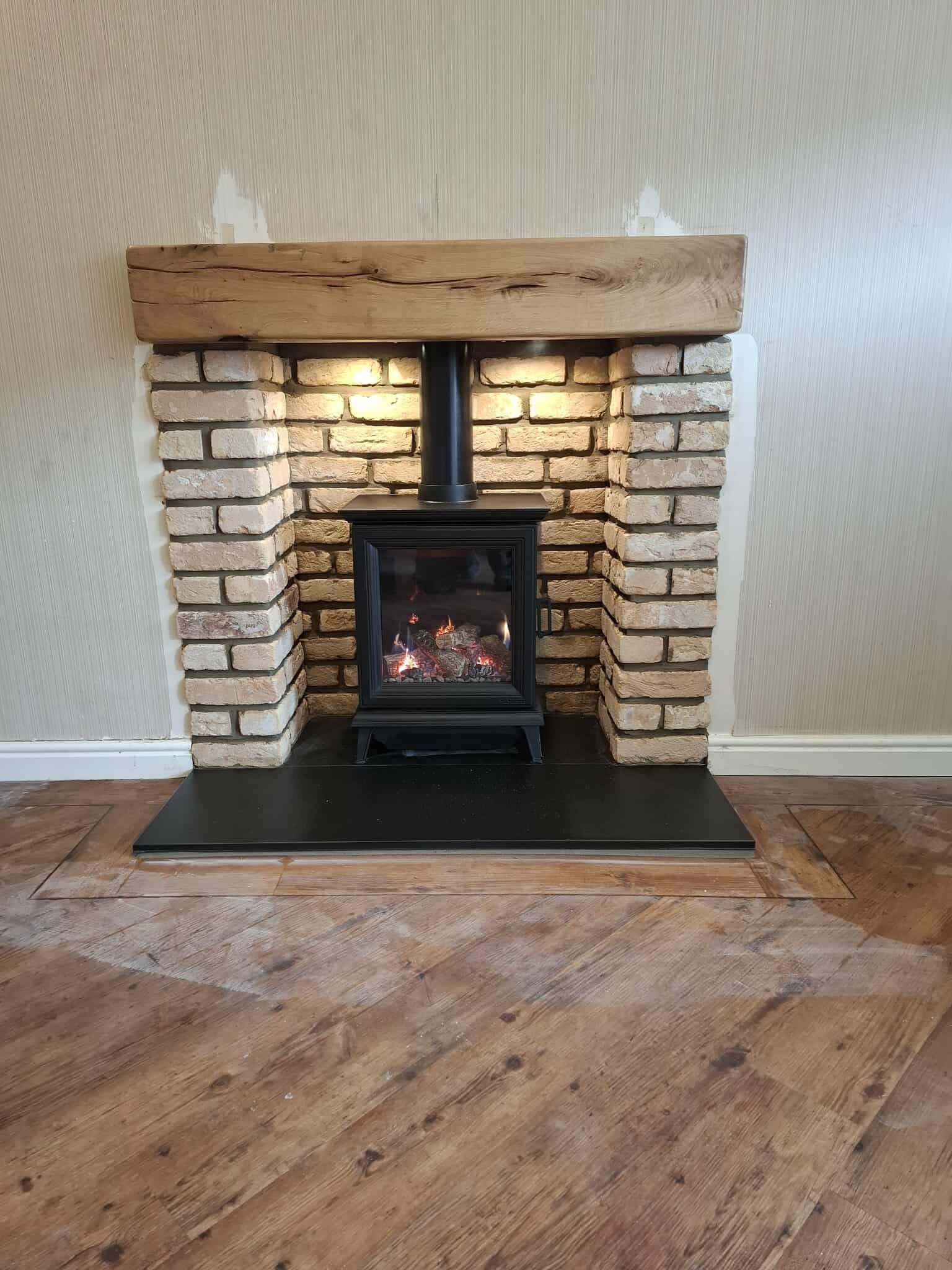 This setup includes brick slips to the back wall and both side returns, forming a full chamber that frames your stove beautifully. The bricks are carefully cut, laid, and pointed by hand for a permanent, solid feel — no flimsy panel kits or factory-fitted boxes.